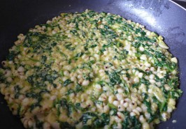 Slzovku propláchneme a namočíme na 20 minut do vody, dáme vařit na 20-30 minut, nejlépe s bio zeleninovým bujónem. Lehce osmažíme šalotku s česnekem. Spaříme špenát a drobně nasekáme. Vejce rozšleháme, přidáme šalotku s česnekem, zázvor, bylinky, špenát, kurkumu, slzovku a mouku, osolíme. Promícháme a vlijeme na pánev s rozpáleným olivovým olejem. Dozlatova opečeme z jedné strany a teprve potom otočíme.