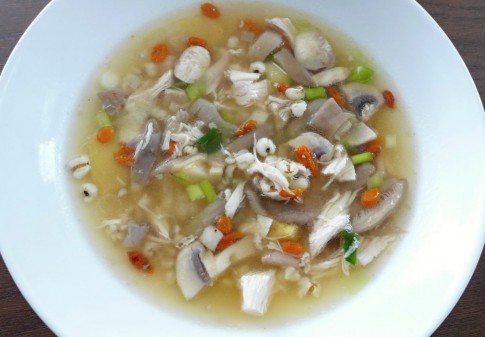 Kuře vložíme do hrnce s vodou, přivedeme k varu, přidáme zázvor a předem namočenou slzovku. Lehce vaříme 1 a 1/2 hodiny. Přidáme všechny ostatní ingredience a vaříme dalších 15 minut. Lepší je předtím kuře vyndat, vykostit ho, maso nakrájet na kousky a vložit zpět do polévky. Na závěr osolíme a opepříme.